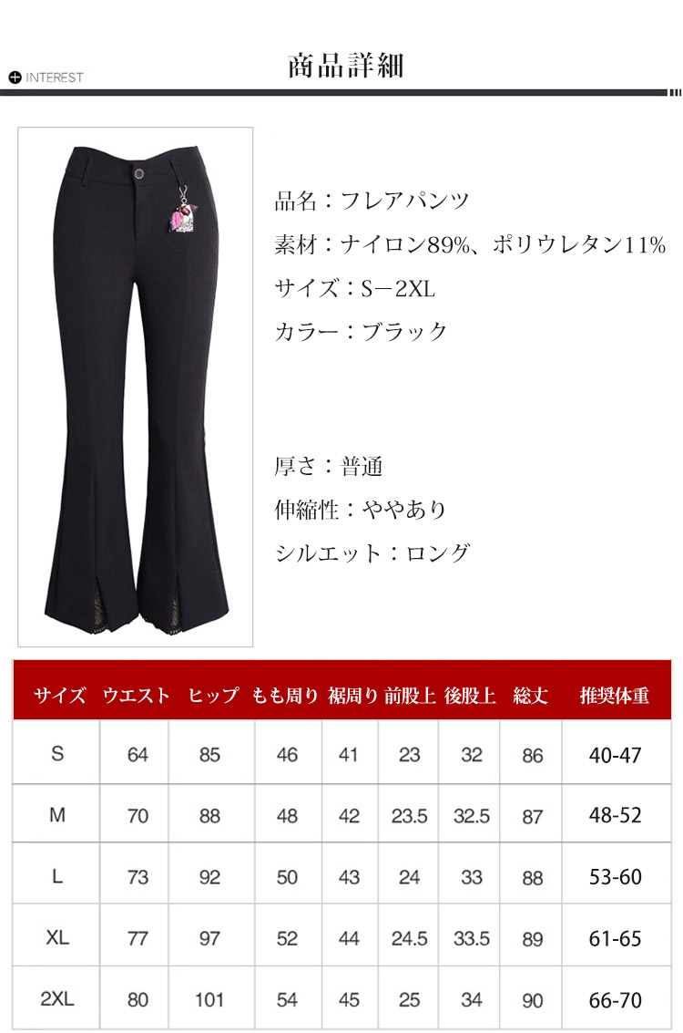 【フレアパンツ】裾レース&スリット入りのフレアパンツ  綺麗な美脚のシルエットに